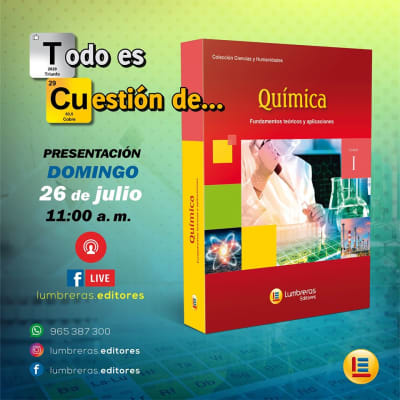 Química, fundamentos teóricos y aplicaciones. Tomo I, es una publicación reciente de nuestro sello Lumbreras Editores. El domingo 26 a las 11 a.m., se realizó la presentación virtual mediante nuestro Facebook Live donde nos acompañaron decenas de alumnos y docentes de diversas partes del Perú como Trujillo, Piura, Cajamarca, quienes escucharon sobre las bondades de esta publicación, actualizaciones y problemas de exámenes de admisión tomados en los últimos años.